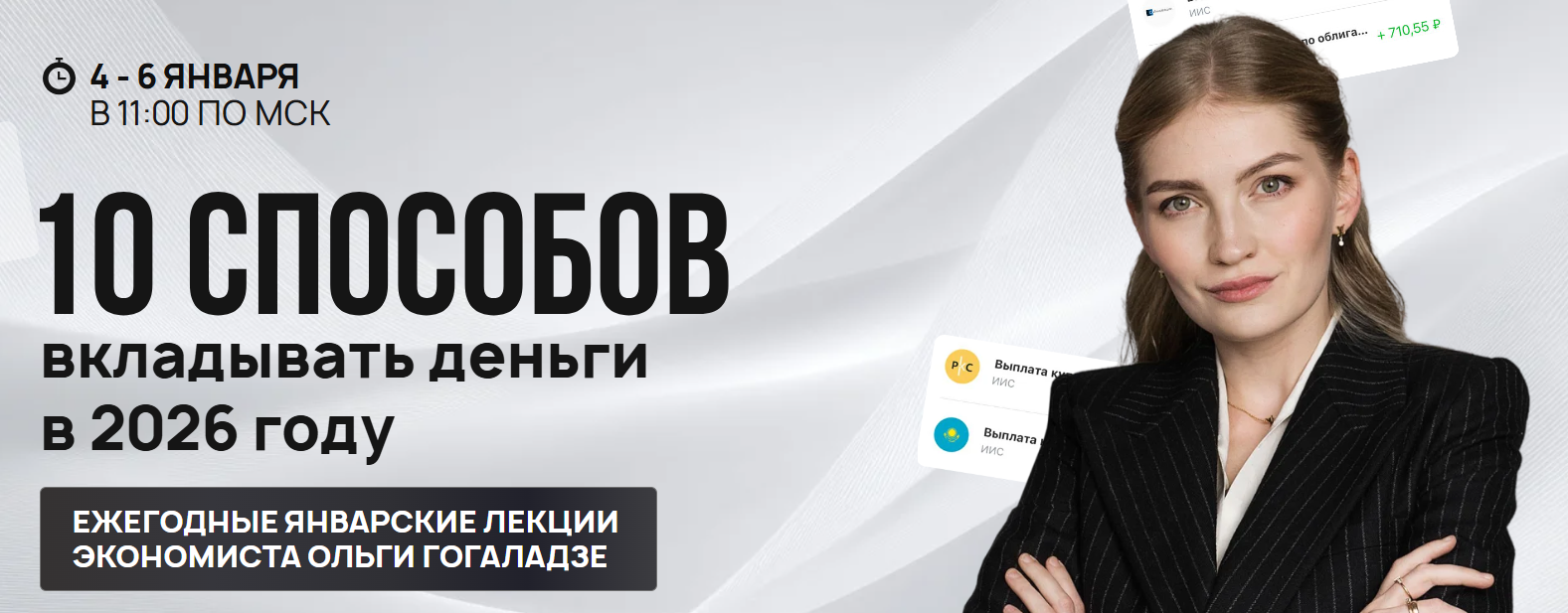 Я приглашаю вас на лекции «10 способов вкладывать деньги». Это будет полная инструкция по управлению деньгами: от вкладов до сложных инструментов. Вы узнаете, как действовать в эпоху высокой ключевой ставки. Можно инвестировать от 100 рублей - это доступно каждому!